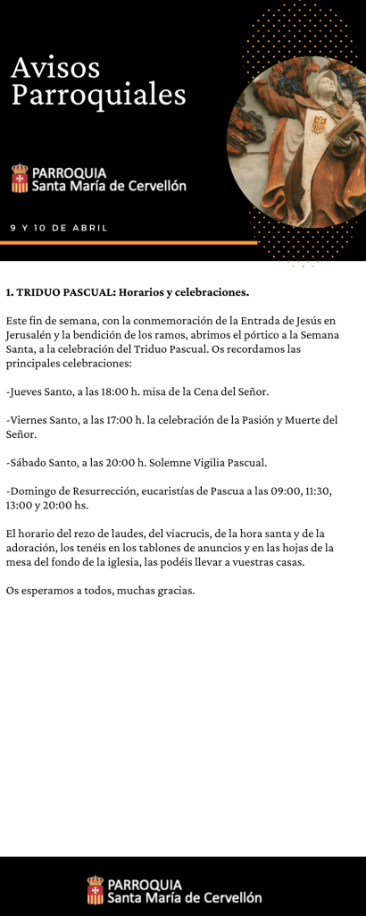 Avisos 2022 – Abril 9 y 10 Publicado porMario Alonso Aguado9 abril, 2022Publicado en Avisos Parroquiales Compártelo: Compartir en X (Se abre en una ventana nueva) X Comparte en Facebook (Se abre en una ventana nueva) Facebook Me gusta Cargando... Relacionado