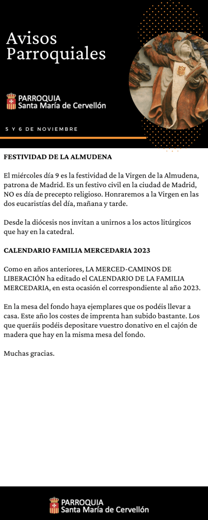 Avisos Parroquiales: 5 y 6 Noviembre Publicado porMario Alonso Aguado5 noviembre, 2022Publicado en Avisos ParroquialesEtiquetas:Avisos Parroquiales, La Merced, lamerced, Mercedarios, Mercedarios de Castilla, mercedarioscastilla, MercedariosdeCastilla, Parroquia Santa Maria de Cervellon, parroquiasantamariacervellon, santamariacervellon Compártelo: Compartir en X (Se abre en una ventana nueva) X Comparte en Facebook (Se abre en una ventana nueva) Facebook Me gusta Cargando... Relacionado