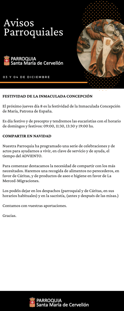 Avisos Parroquiales: 03 y 04 Diciembre Publicado porMario Alonso Aguado3 diciembre, 2022Publicado en Avisos ParroquialesEtiquetas:Avisos Parroquiales, La Merced, lamerced, Mercedarios, Mercedarios de Castilla, mercedarioscastilla, MercedariosdeCastilla, Parroquia Santa Maria de Cervellon, parroquiasantamariacervellon, santamariacervellon Compártelo: Haz clic para compartir en X (Se abre en una ventana nueva) X Haz clic para compartir en Facebook (Se abre en una ventana nueva) Facebook Me gusta Cargando... Relacionado
