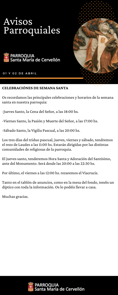 Avisos Parroquiales: 01 y 02 Abril Publicado porMario Alonso Aguado1 abril, 2023Publicado en Avisos ParroquialesEtiquetas:Avisos Parroquiales, La Merced, lamerced, Mario Alonso aguado, Mercedarios, Mercedarios de Castilla, mercedarioscastilla, MercedariosdeCastilla, Parroquia Santa Maria de Cervellon, parroquiasantamariacervellon, santamariacervellon Compártelo: Haz clic para compartir en X (Se abre en una ventana nueva) X Haz clic para compartir en Facebook (Se abre en una ventana nueva) Facebook Me gusta Cargando... Relacionado