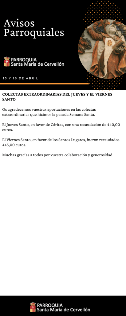 Avisos Parroquiales: 15 y 16 Abril Publicado porMario Alonso Aguado15 abril, 2023Publicado en Avisos ParroquialesEtiquetas:Avisos Parroquiales, La Merced, lamerced, Mercedarios, Mercedarios de Castilla, mercedarioscastilla, MercedariosdeCastilla, Parroquia Santa Maria de Cervellon, parroquiasantamariacervellon, santamariacervellon Compártelo: Haz clic para compartir en X (Se abre en una ventana nueva) X Haz clic para compartir en Facebook (Se abre en una ventana nueva) Facebook Me gusta Cargando... Relacionado