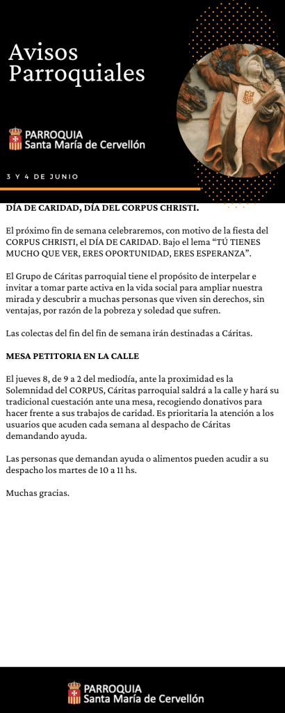Avisos Parroquiales: 3 y 4 Junio Publicado porMario Alonso Aguado2 junio, 2023Publicado en Avisos ParroquialesEtiquetas:Avisos Parroquiales, La Merced, lamerced, Mercedarios, Mercedarios de Castilla, mercedarioscastilla, MercedariosdeCastilla, Parroquia Santa Maria de Cervellon, parroquiasantamariacervellon, santamariacervellon Compártelo: Compartir en X (Se abre en una ventana nueva) X Comparte en Facebook (Se abre en una ventana nueva) Facebook Me gusta Cargando... Relacionado