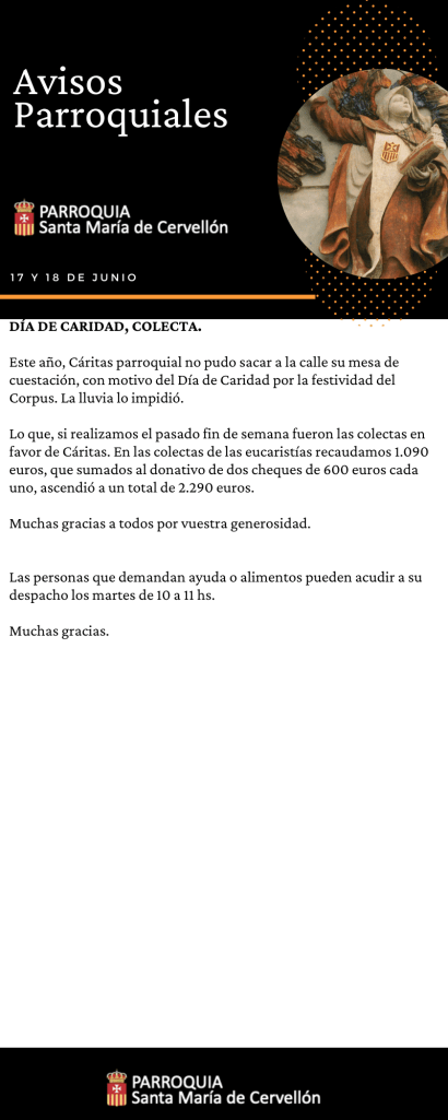 Avisos Parroquiales: 17 y 18 Junio Publicado porMario Alonso Aguado17 junio, 2023Publicado en Avisos ParroquialesEtiquetas:Avisos Parroquiales, La Merced, lamerced, Mercedarios, Mercedarios de Castilla, mercedarioscastilla, MercedariosdeCastilla, Parroquia Santa Maria de Cervellon, parroquiasantamariacervellon, santamariacervellon Compártelo: Compartir en X (Se abre en una ventana nueva) X Comparte en Facebook (Se abre en una ventana nueva) Facebook Me gusta Cargando... Relacionado