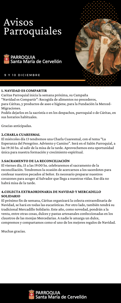 Avisos Parroquiales: 9 y 10 Diciembre Publicado porMario Alonso Aguado9 diciembre, 2023Publicado en Avisos ParroquialesEtiquetas:Avisos Parroquiales, La Merced, lamerced, Mercedarios, Mercedarios de Castilla, mercedarioscastilla, MercedariosdeCastilla, Parroquia Santa Maria de Cervellon, parroquiasantamariacervellon, santamariacervellon Compártelo: Compartir en X (Se abre en una ventana nueva) X Comparte en Facebook (Se abre en una ventana nueva) Facebook Me gusta Cargando... Relacionado