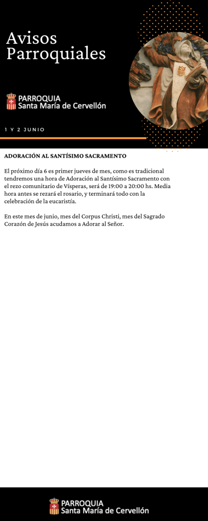 Avisos Parroquiales: 1 y 2 Junio Publicado porMario Alonso Aguado31 mayo, 2024Publicado en Avisos ParroquialesEtiquetas:Avisos Parroquiales, La Merced, lamerced, Mercedarios, Mercedarios de Castilla, mercedarioscastilla, MercedariosdeCastilla, Parroquia Santa Maria de Cervellon, parroquiasantamariacervellon, santamariacervellon Compártelo: Haz clic para compartir en X (Se abre en una ventana nueva) X Haz clic para compartir en Facebook (Se abre en una ventana nueva) Facebook Me gusta Cargando... Relacionado