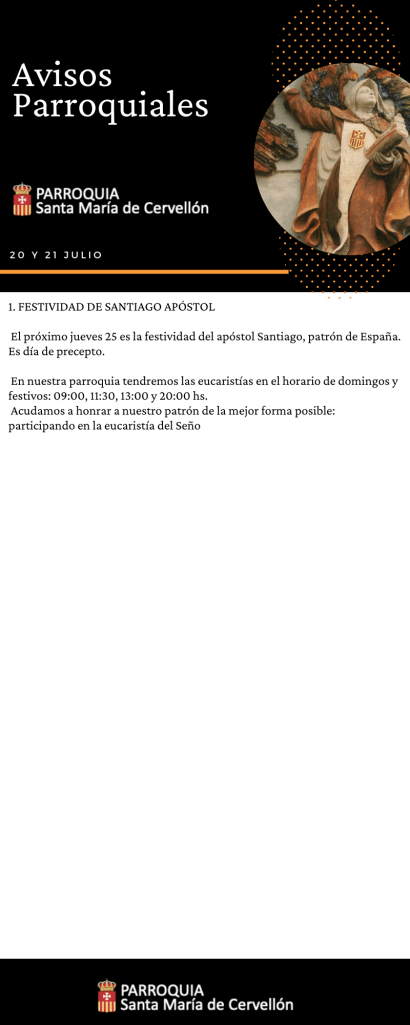 Avisos Parroquiales:20 y 21 Julio Publicado porMario Alonso Aguado20 julio, 2024Publicado en Avisos ParroquialesEtiquetas:Avisos Parroquiales, La Merced, lamerced, Mercedarios, Mercedarios de Castilla, mercedarioscastilla, MercedariosdeCastilla, Parroquia Santa Maria de Cervellon, parroquiasantamariacervellon, santamariacervellon Compártelo: Compartir en X (Se abre en una ventana nueva) X Comparte en Facebook (Se abre en una ventana nueva) Facebook Me gusta Cargando... Relacionado