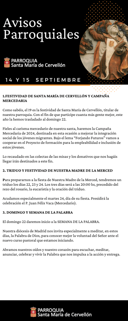 Avisos Parroquiales: 14 y 15 Septiembre Publicado porMario Alonso Aguado13 septiembre, 2024Publicado en Avisos ParroquialesEtiquetas:Avisos Parroquiales, La Merced, lamerced, Mercedarios, Mercedarios de Castilla, mercedarioscastilla, MercedariosdeCastilla, Parroquia Santa Maria de Cervellon, parroquiasantamariacervellon, santamariacervellon Compártelo: Compartir en X (Se abre en una ventana nueva) X Comparte en Facebook (Se abre en una ventana nueva) Facebook Me gusta Cargando... Relacionado