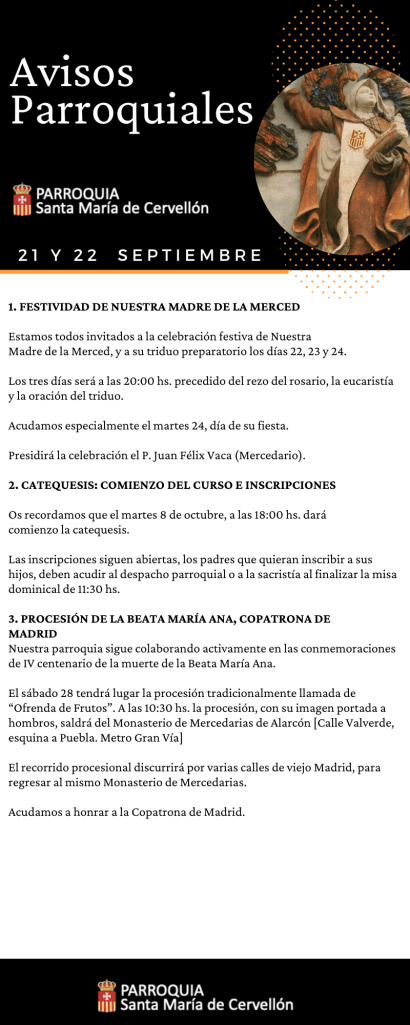 Avisos Parroquiales: 21 y 22 Septiembre Publicado porMario Alonso Aguado21 septiembre, 2024Publicado en Avisos ParroquialesEtiquetas:Avisos Parroquiales, La Merced, lamerced, Mercedarios, Mercedarios de Castilla, mercedarioscastilla, MercedariosdeCastilla, Parroquia Santa Maria de Cervellon, parroquiasantamariacervellon, santamariacervellon Compártelo: Compartir en X (Se abre en una ventana nueva) X Comparte en Facebook (Se abre en una ventana nueva) Facebook Me gusta Cargando... Relacionado