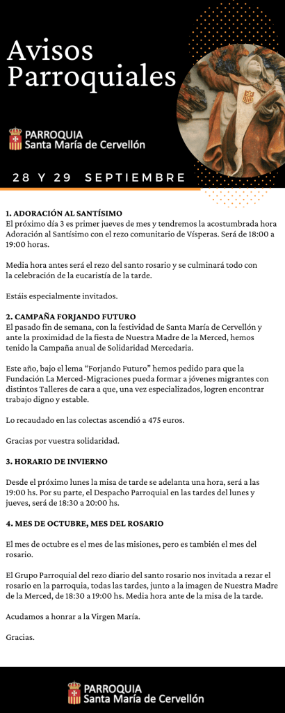 Avisos Parroquiales: 28 y 29 Septiembre Publicado porMario Alonso Aguado28 septiembre, 2024Publicado en Avisos ParroquialesEtiquetas:Avisos Parroquiales, La Merced, lamerced, Mercedarios, Mercedarios de Castilla, mercedarioscastilla, MercedariosdeCastilla, Parroquia Santa Maria de Cervellon, parroquiasantamariacervellon, santamariacervellon Compártelo: Haz clic para compartir en X (Se abre en una ventana nueva) X Haz clic para compartir en Facebook (Se abre en una ventana nueva) Facebook Me gusta Cargando... Relacionado