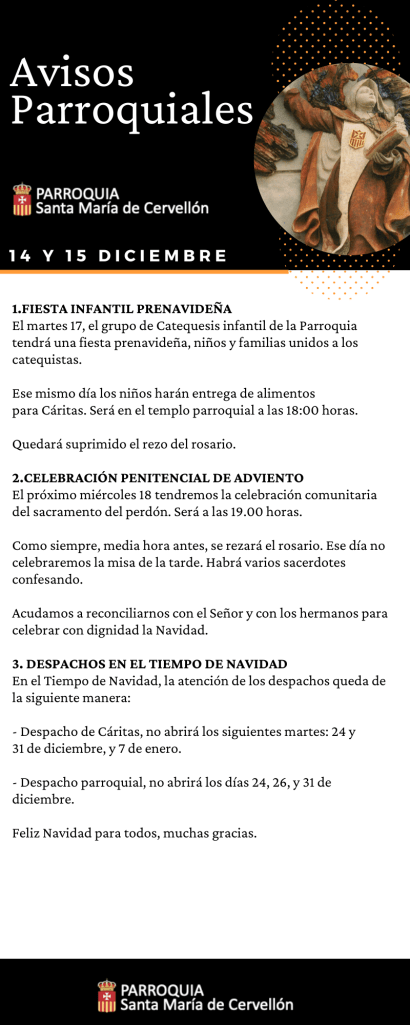 Avisos Parroquiales: 14 y 15 Diciembre Publicado porMario Alonso Aguado14 diciembre, 202414 diciembre, 2024Publicado en Avisos ParroquialesEtiquetas:Avisos Parroquiales, La Merced, lamerced, Mercedarios, Mercedarios de Castilla, mercedarioscastilla, MercedariosdeCastilla, Parroquia Santa Maria de Cervellon, parroquiasantamariacervellon, santamariacervellon Compártelo: Compartir en X (Se abre en una ventana nueva) X Comparte en Facebook (Se abre en una ventana nueva) Facebook Me gusta Cargando... Relacionado