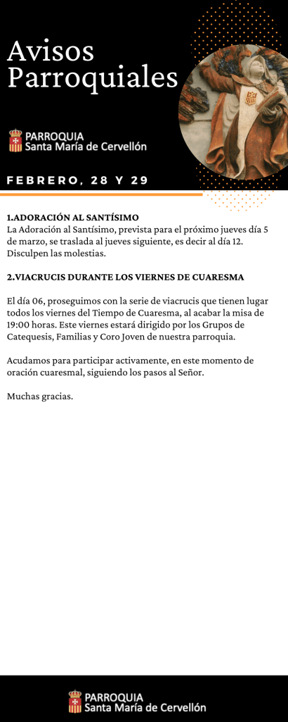Avisos Parroquiales: 27 y 28 Febrero Publicado porMario Alonso Aguado28 febrero, 2026Publicado en Avisos ParroquialesEtiquetas:Avisos Parroquiales, Mercedarios Compártelo: Compartir en X (Se abre en una ventana nueva) X Comparte en Facebook (Se abre en una ventana nueva) Facebook Me gusta Cargando... Relacionado