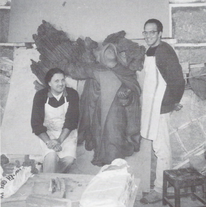 El artista cubano Alfredo G. Vázquez -que realizó el Árbol de la Vida, para el Sagrario, la Cenefa de los pecados capitales bajo la vidriera central, y ,con el gallego Chema Dapena, Santa María de Cervellón, para la fachada exterior del templo- decoró, finalmente, el muro frontal del baptisterio con una obra magistral: Tres grandes círculos concéntricos -símbolo de la Trinidad, en cuyo nombre se recibe el bautismo-, rodeados por doce llamitas -que simbolizan el fuego del Espíritu Santo sobre los doce apóstoles, y sobre cada bautizado—, y en el centro el rostro, por el que se desliza el agua, símbolo del ser humano renacido por el agua y el espíritu.