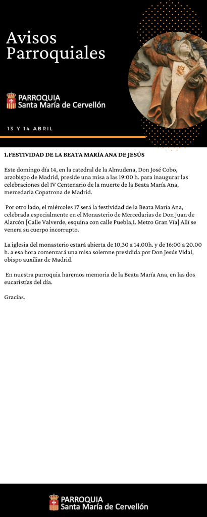 Avisos Parroquiales: 13 y 14 Abril